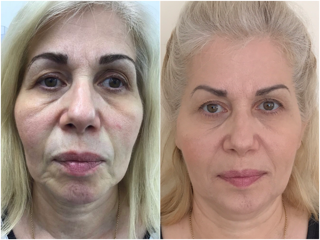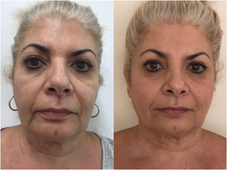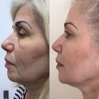 Before treatment (left). Naso labial lines treated with Restylane. Marionette lines treated with Restylane. (right)